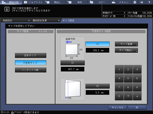登録済みの不定形サイズを読出す場合は、[サイズ読出し]を押したあと、使用する不定形サイズの登録番号キーを選択します。