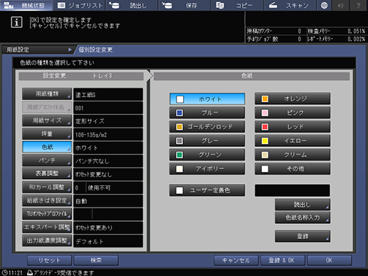 用紙の色を設定すると、コピー時やオートトレイスイッチ時に、誤った給紙トレイの選択の防止に役立ちます。