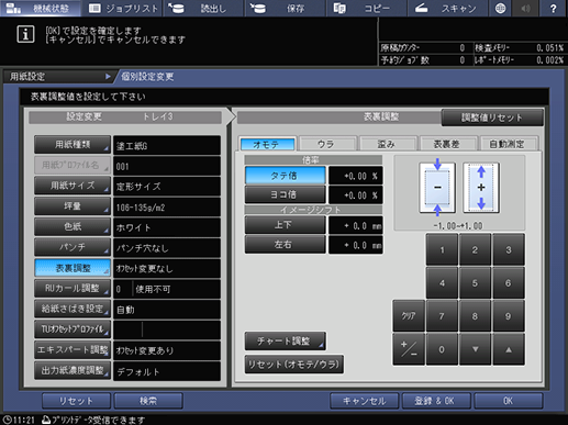 タッチパネル - [機械状態] - [用紙設定] - [新規設定] - [表裏調整]