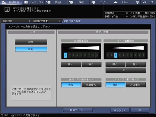 [弱く]を押すとサイド風量が弱くなり、薄紙の給送性が改善されることがあります。[強く]を押すとサイド風量が強くなり、厚紙の給送性が改善されることがあります。サイド風量をOFFにするときは、[OFF]を選択します。