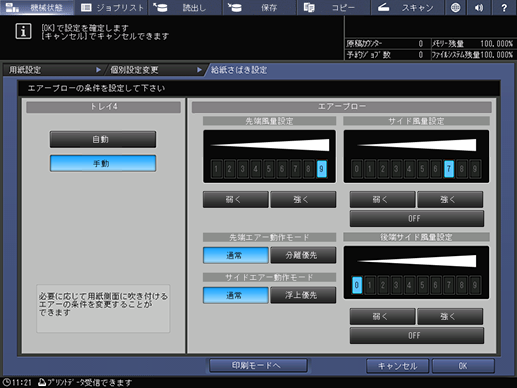 [弱く]を押すとサイド風量が弱くなり、薄紙の給送性が改善されることがあります。[強く]を押すとサイド風量が強くなり、厚紙の給送性が改善されることがあります。サイド風量をOFFにするときは、[OFF]を選択します。