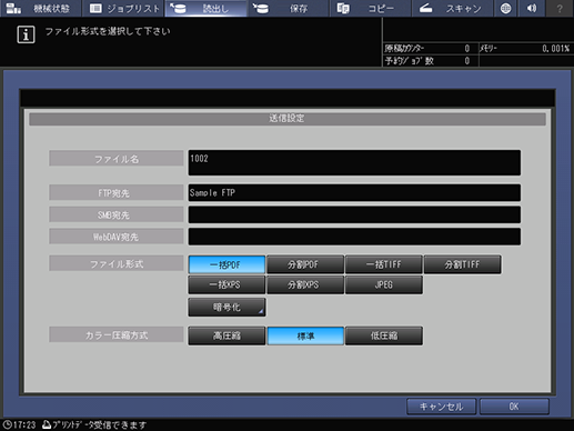 FTPやSMB、WebDAVの宛先にHDD保存ジョブを送信するときの、ファイル形式や圧縮方法を設定します。
