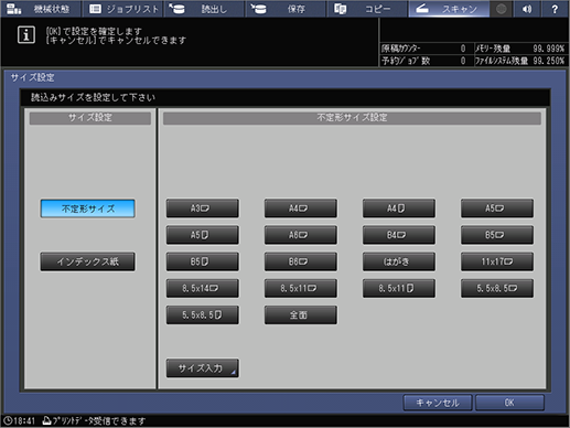 [サイズ設定] | [不定形サイズ] | 読込みサイズを手動で設定します。セットした原稿サイズに関係なく、読込む範囲を設定できます。 用紙サイズ選択キー:読込むサイズを選択します。 [全面]:最大読取り領域297.0 mm e 431.8 mm / 11.69" e 17" で読込みます。 [サイズ入力]:読込むサイズを任意に設定します。詳しくは、設定手順(読込みサイズを任意に設定する)をごらんください。 |