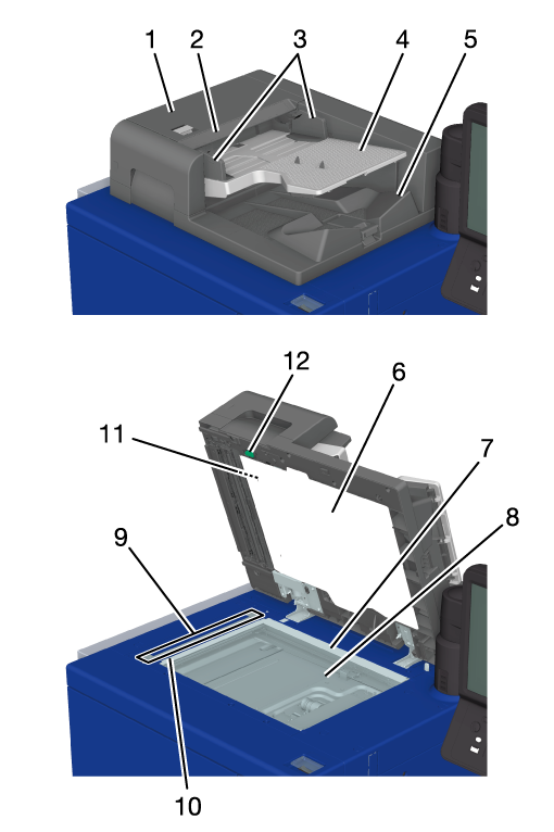 1 | 原稿左搬送カバー | 原稿がつまったときに、左に開いて処理します。 |