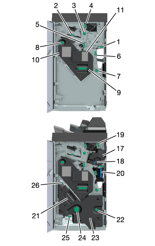 25 | レバー[SD8] | 紙づまり処理のときに、サドルユニットを引出してから、レバーを持ってガイドを開けて用紙を取除きます。 |