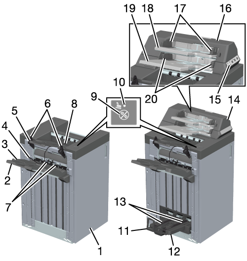 1 | フィニッシャー前扉 | 平とじステープル針を補給するときや、紙づまり処理のときに開けます。パンチユニット PK-525を装着しているときは、パンチくずを処理するときに開けます。中綴じ機 SD-510を装着しているときは、中とじステープル針を補給するときや、中とじ機の紙づまりを処理するときに開けます。 |