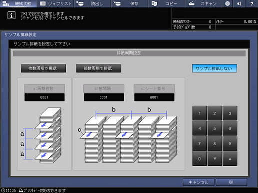 [サンプル排紙設定]:事前に設定した周期で自動的にサンプル排紙します。出力前に[機械状態]画面下部にある[サンプル排紙設定]を押すことで、サンプル排紙を行う周期を設定できます。周期は枚数または部数で設定します。