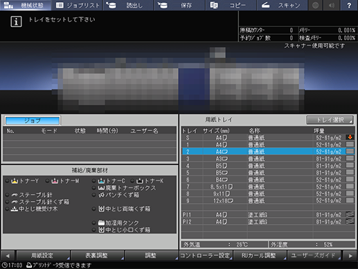 [機械状態]画面には、各給紙トレイの残量が表示されます。