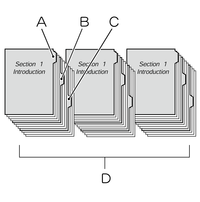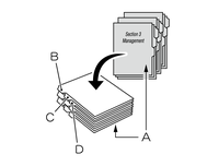 A:奥側 B:手前側 | A:印刷された面/プリントする面(下向き) B:1枚目のインデックス紙 C:2枚目のインデックス紙 D:3枚目のインデックス紙 | A:1枚目のインデックス紙 B:2枚目のインデックス紙 C:3枚目のインデックス紙 D:1部の印刷セット |