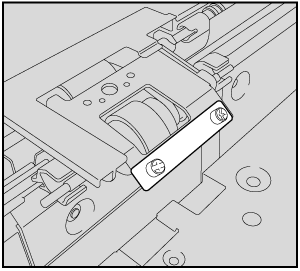 用紙の種類やサイズ、坪量によって給紙不良が発生するときは、下図のように付属のおもりをピックアップローラー部に取付けることで給紙性能が改善できる場合があります。おもりの枚数で調整してください。大容量給紙ユニット LU-208XLに257 g/m2 / 69 lb Bond以上かつ長さ539 mm / 21.22" までの長尺用紙をセットする場合は、あらかじめおもり(大)を1枚取付け、その後おもりの枚数で調整してください。