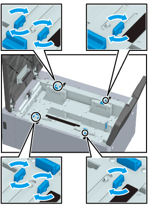 側面ガイド(左)の側面ガイドツマミ(4箇所)と、側面ガイド(右)の側面ガイドツマミ(2箇所)を、時計方向に回して固定します。
