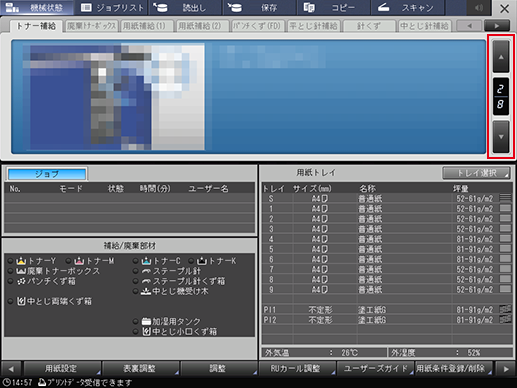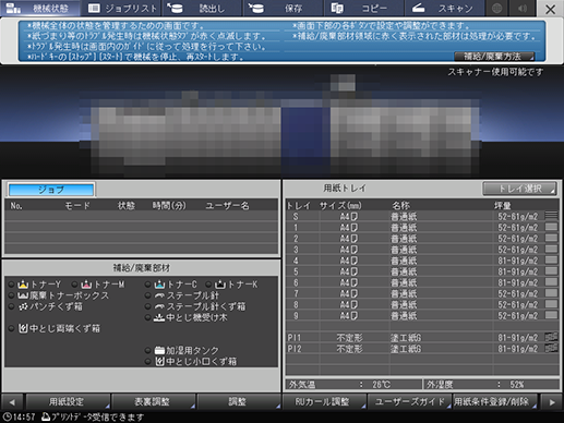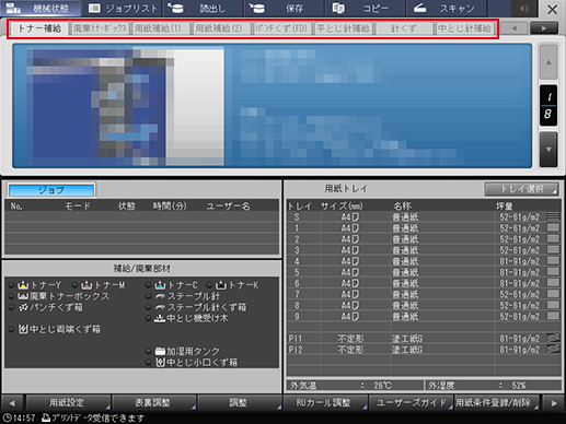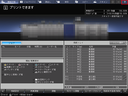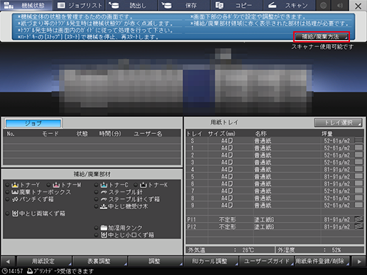 [機械状態]画面左下[補給/廃棄部材]欄の各項目を押しても、ヘルプメッセージの表示ができます。押した項目のヘルプメッセージが直接表示されるので、便利です。この場合は、手順5に進みます。