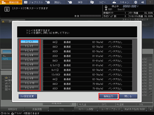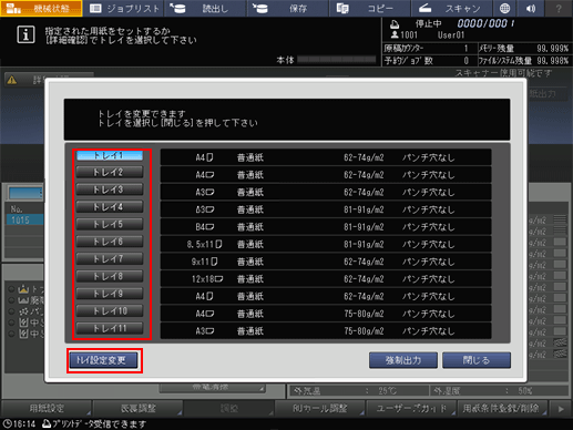 トレイを選択しないメッセージが表示されたときは、任意のトレイを選択して、その用紙設定(現在の設定)を印刷データが要求している設定(予約した設定)に変更します。変更した用紙設定に適合した用紙をそのトレイにセットして、印刷します。