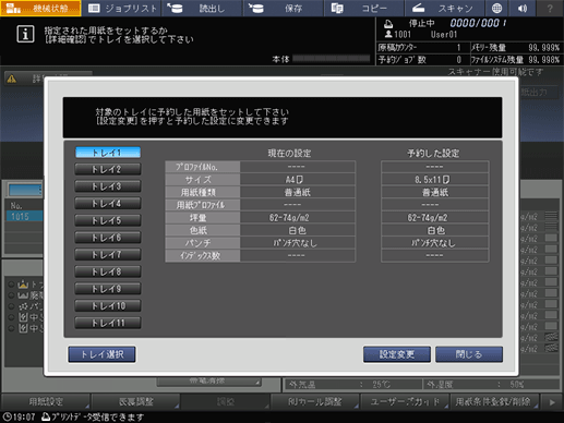選択したトレイの用紙設定(現在の設定)と印刷データが要求している用紙設定(予約した設定)が表示されます。