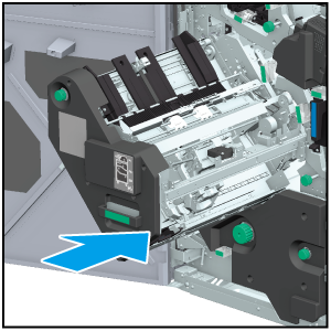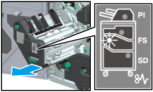 フィニッシャー FS-532のスタッカーには、用紙の通紙方向の位置を整えるタテ整合板があります。タテ整合板が停止した位置によって、紙づまり位置表示パネルが点滅して、出力できないことがあります。