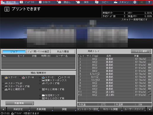 [機械状態]画面が表示されます。稼働中の本機の状態の確認や、画面下部のキーから各種設定ができます。 | |