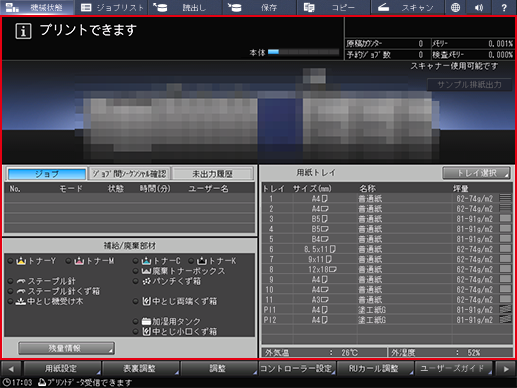 [機械状態] | [機械状態]画面が表示されます。 本機の状態や装着しているオプションなどがビジュアルでわかりやすく表示されます。 |