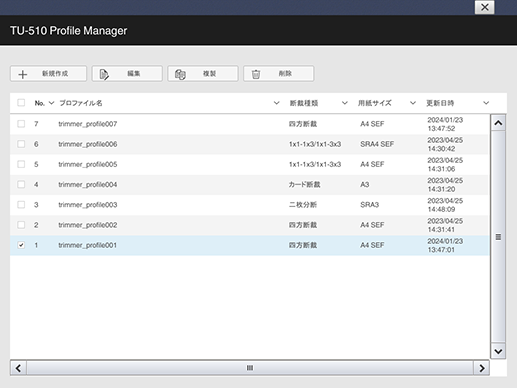 [複製] | 選択したトリマープロファイルを複製します。 押すと、元のプロファイル名と同じトリマープロファイルが別番号で一覧に追加されます。 必要に応じて、トリマープロファイル名や設定を編集してください。 |
