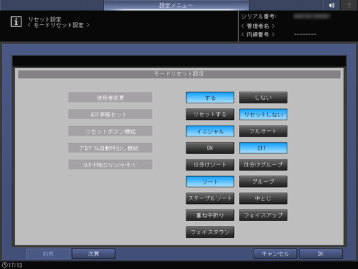 [フルオート] | 本機をリセットした場合、出荷時設定に戻します。ただし、[フルオート時のフィニッシャーモード]は任意に変更できます。 | |