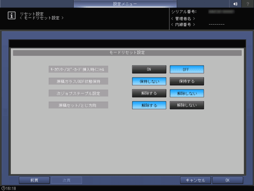 [保持する] | 本機をリセットしたときに、リセット前の原稿ガラスとADFの状態を保持します。 | |