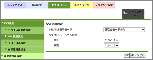 [SSL/TLSバージョン設定] | [TLSv1.0] | メニューリストから使用するSSL/TLSバージョンを選択します。 セキュリティレベル[最低]および[最高]それぞれで設定できます。 |