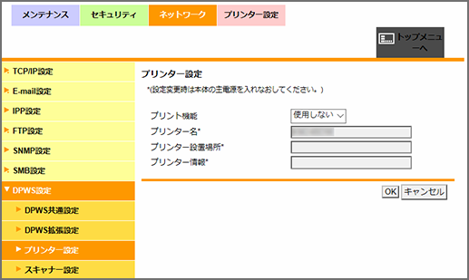 [プリンター情報]* | 使用するWebサービスのプリンターについての情報を任意で設定します。 半角63文字まで入力できます。 | |
