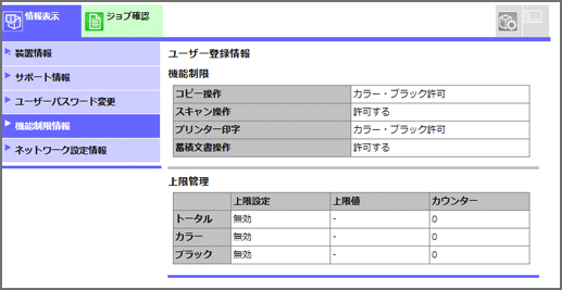 ログインしている登録ユーザーの機能制限情報が表示されます。