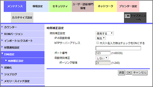 [調整] | NTPサーバーに接続して、本機の日時を調整します。 | |