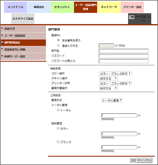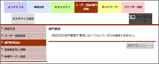 [部門管理認証方式]が[パスワードのみ]の場合は、入力できません。