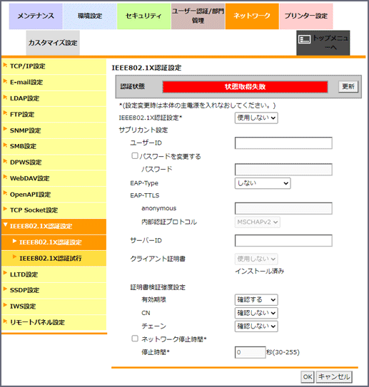 [停止時間]* | 認証を開始してからネットワーク通信を停止するまでの猶予時間(秒)を設定します。 設定範囲:30秒 ~ 255秒 ネットワーク通信の停止後に再度認識する場合は、本機の電源を入れ直してください。 | |