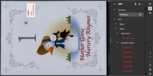 基準外画像レポート:検品レベルを満たさなかった出力物のレポートです。このレポートでは、基準外と判定された印刷結果画像を確認することができます。検知箇所には、PDF上に注釈が入ります。注釈内には、検知の種類、検知レベル、座標などが記載されます。また、[しおり]には検知数やページ情報が表示されます。