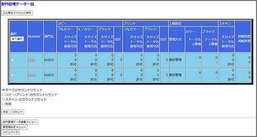 登録部門ごとの各種操作のカウンターのリセットもできます。