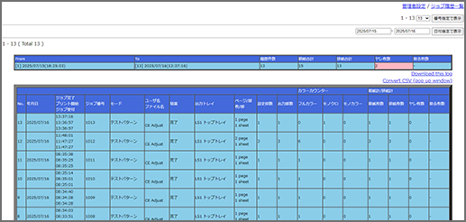 [Convert CSV (pop up window)] | 別ウィンドウに CSV形式で[ジョブ履歴一覧]画面を表示します。 | |