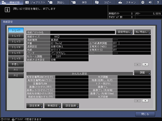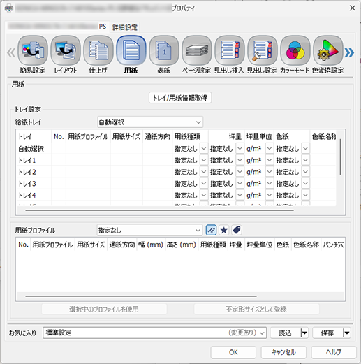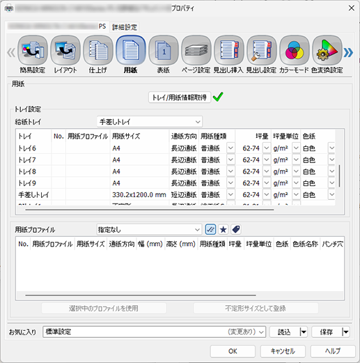 [用紙]タブを選択し、[トレイ/用紙情報取得]をクリックします。