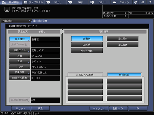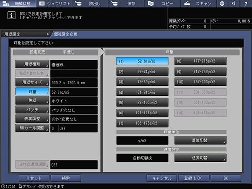 塗工紙が選択できない場合は、[坪量]を81 g/m2 / 22 lb Bond以上に設定すると選択できます。