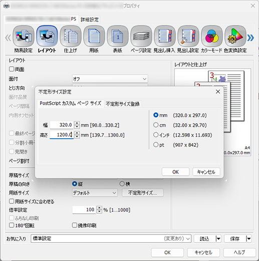 [不定形サイズ]を選択し、用紙サイズ(ここでは、タテ330.2 mm e ヨコ1,200.0 mm / タテ13.0" e ヨコ47.24")を設定します。