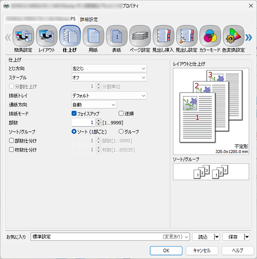 [仕上げ]タブを選択し、[排紙モード]の[フェイスアップ]にチェックを入れます。