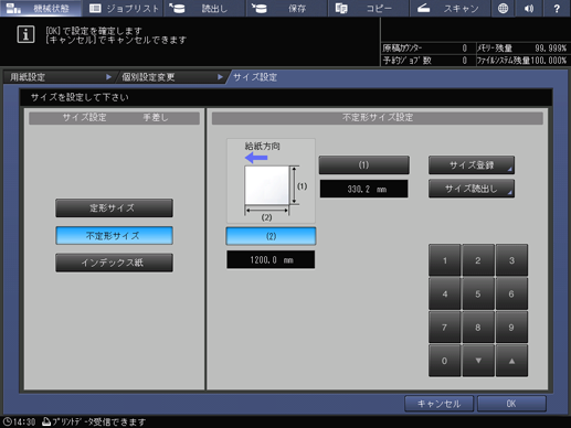 [(1)](通紙交差方向)または[(2)](通紙方向)を選択し、画面のテンキーまたは操作パネルのテンキーで数値を入力します。