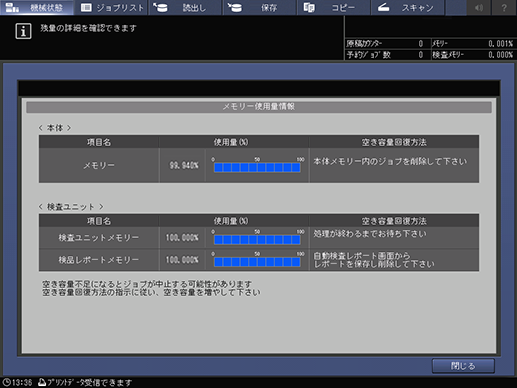 本体および紙面検査ユニット AI-101のメモリー使用量を確認できます。