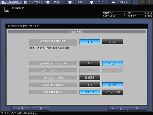 本機のタッチパネルの[機械状態] - [基準画像管理]画面にも、印刷したデータが基準画像として登録され、表示されます。詳しくは、[基準画像管理]をごらんください。