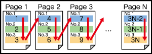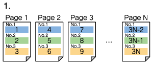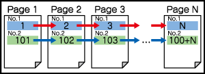 1 | [ページ内確認] | 領域No.のデコード結果が規則正しく並んでいることを確認してください。 また、ページ内の最後の領域No.のデコード結果と次用紙の最初の領域No.のデコード結果が規則正しく並んでいるかを確認してください。 たとえば、図1の1 ~ 2枚目間の場合、1枚目の領域No.3と2枚目の領域No.1のデコード結果は、3、4と並んでいるので問題ありません。 |