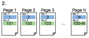 2 | [ページ間確認(同一領域のみ)] | 各領域No.毎のデコード結果が用紙間でシーケンシャルに並んでいることを確認してください。 図2の例で、ページ間で領域No.1のデコード結果が、1、2、3と規則正しく並んでいるので問題ありません。 次に領域No.2についても同様に確認します。この場合、デコード結果が、101、102、103と規則正しく並んでいるので問題ありません。 |