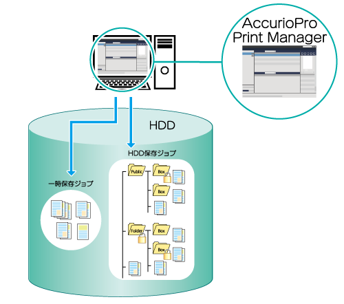 フォルダーやボックスに分けてプリントジョブを保存できます。フォルダーやボックスは、必要に応じて後からパスワードを設定できます。(HDD保存ジョブ)