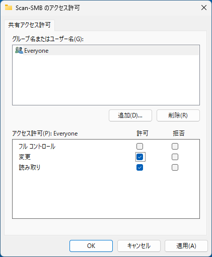 [Everyone]を選択するとすべてのユーザーにアクセス許可を設定します。