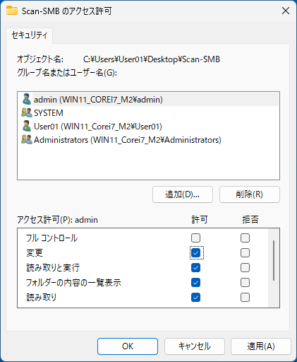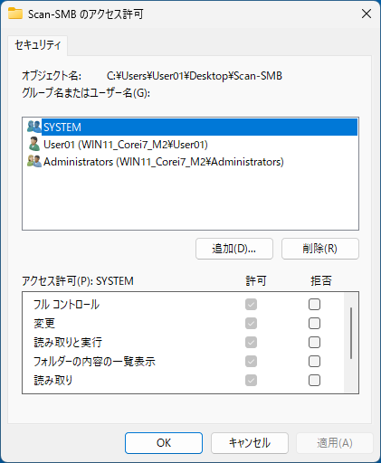 アクセス許可を与えたいグループまたはユーザーが表示されていないときは[追加]をクリックして、ユーザーまたはグループを追加します。