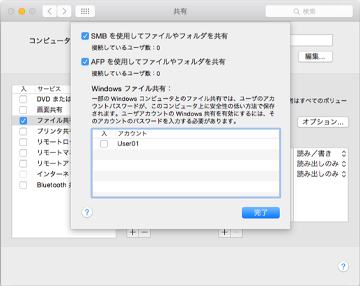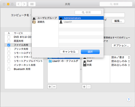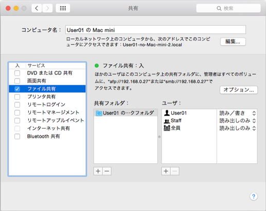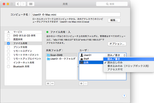 デフォルトでは、お使いのMacintoshの[ユーザとグループ]環境設定で設定されたユーザーが、ネットワーク経由でMacintoshに接続できます。