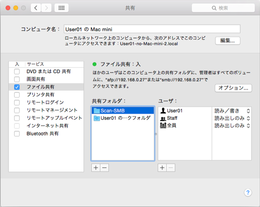 Macintoshに共有フォルダーを作成します。本機からのスキャンデータを共有フォルダーに受信して、クライアントコンピューターと共有します。