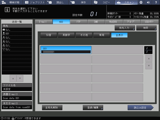 宛先や[読込み設定]画面の設定は送信後も解除されずに残ることがあります。操作が終了したら、設定と宛先を解除することをおすすめします。[読込み設定]画面で操作パネルのリセットを押すと、設定を解除できます。また、[スキャン]画面で[全宛先解除]または操作パネルのリセットを押すと、宛先を解除できます。