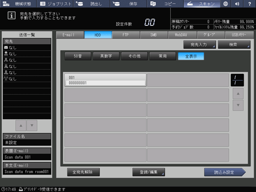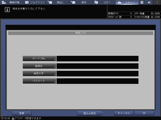 [ボックスNo.]:ボックス番号(000000001 ~ 999999998)を入力します。番号の前部分の「0」は省略できます(例:「000000001」の場合は「1」で入力できます)。