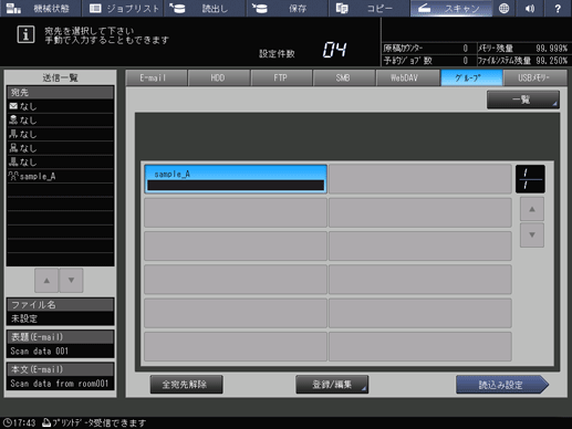 グループを選択して[一覧]を押すと、グループに登録されている宛先を確認できます。